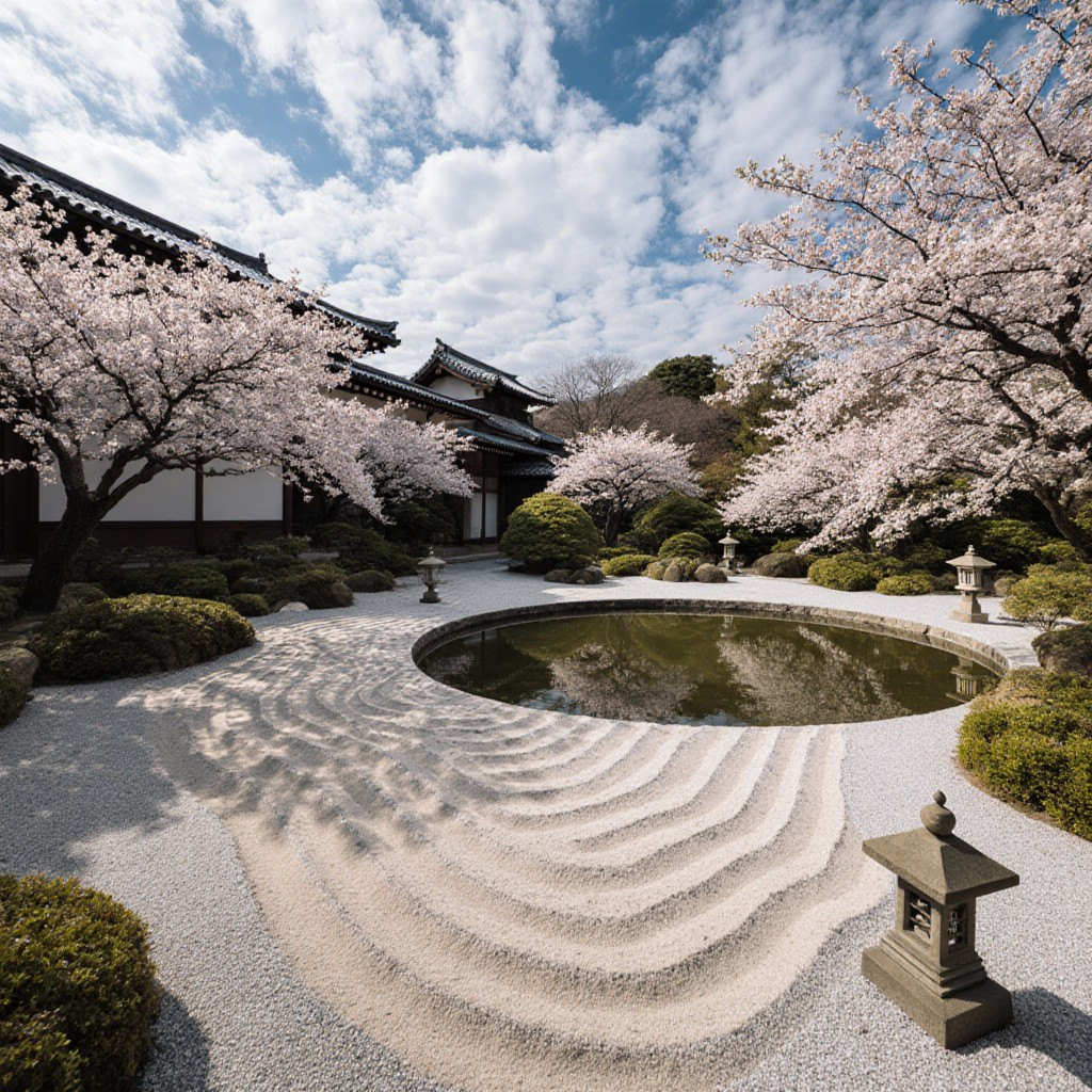 The design features a traditional Japanese garden, complete with carefully raked sand, smooth stepping stones, and a pond where koi swim gracefully. Cherry blossoms drift gently from above, their pink petals creating bursts of color against the calm sand patterns. Stone lanterns and wooden bridges add authentic touches, guiding the eye across the composition.